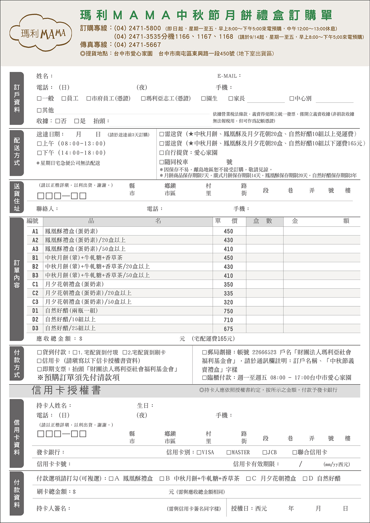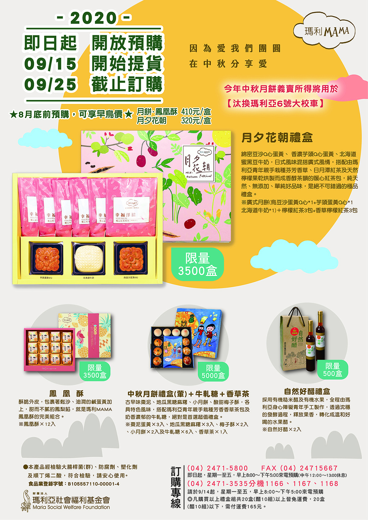 今年受疫情影響導致募款減少,期盼各界支持今年中秋月餅義賣,義賣所得將用於汰換瑪利亞「6號大校車」期盼各界支持,8月底前預購另有折扣喔!請洽訂購專線:04-24715800