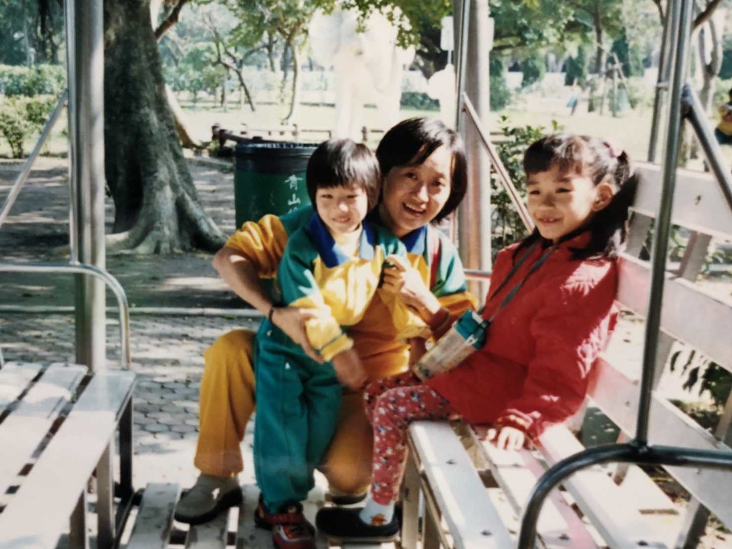 民國89年五權園區早療組在美術綠園道戶外教學,素梅副主任與服務對象合影。