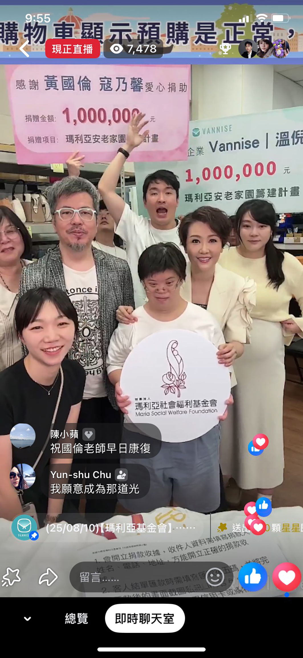 直播時粉絲反應熱烈,逾7400位粉絲同時在線支持公益,黃國倫、寇乃馨更與Vannise溫倪詩宣佈雙方各捐贈100萬元,讓氣氛嗨到最高點。