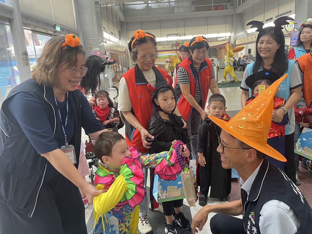 當天孩子們穿上各式創意造型服裝,透過可愛的不給糖活動,在輕鬆的氛圍中學習語言表達與練習社交技巧,活動中沈政安局長及文心分局-陳明惠主任率領同仁及志工,帶著早療天使們一起歡樂唱跳秀,活力十足的與民眾互動連結,傳遞出「每個孩子都值得被肯定」的早療服務精神。