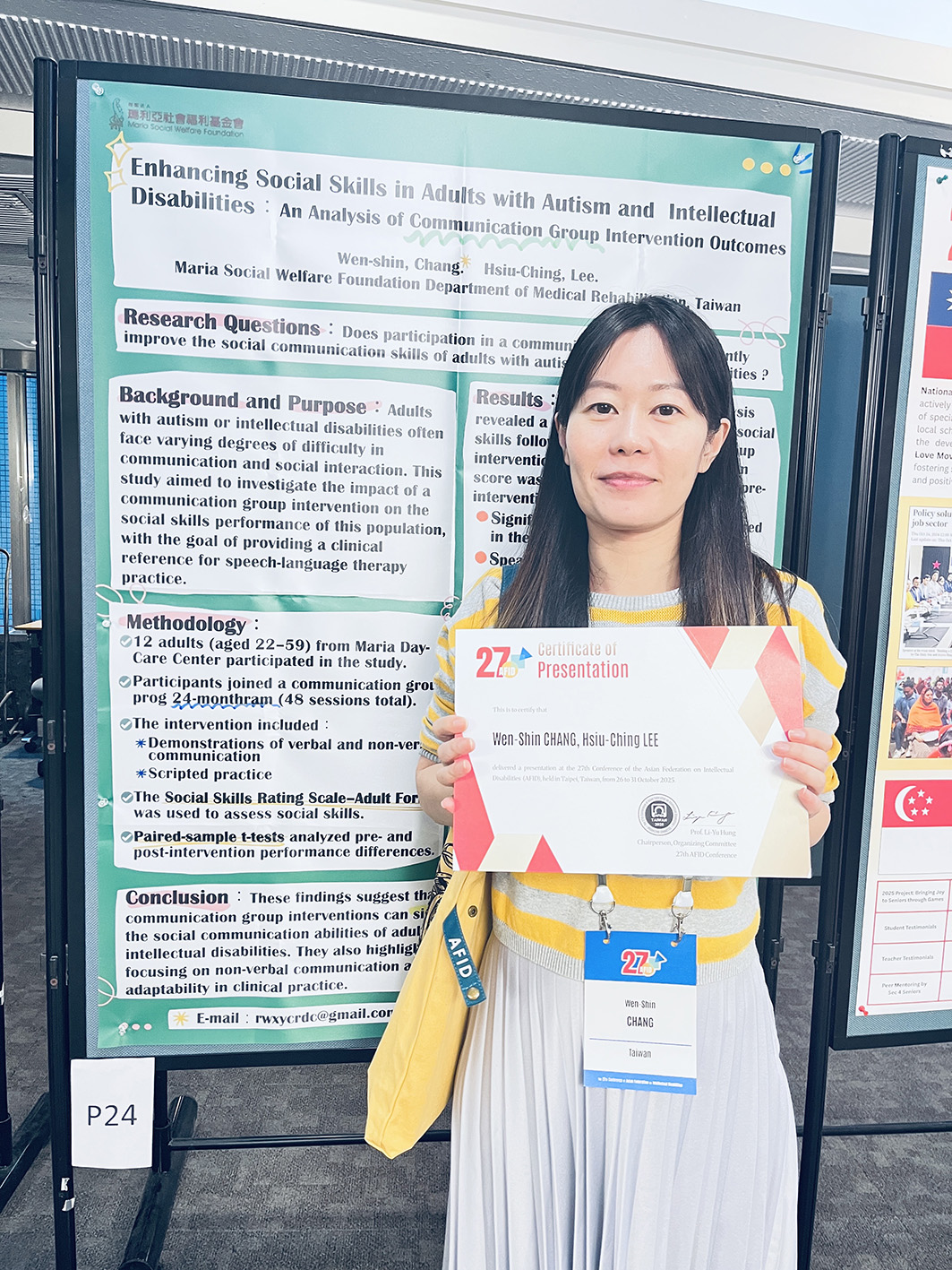 | 語言治療師張芠馨於2025第二十七屆亞洲智能障礙聯盟大會(AFID)發表海報論文,主題為「The Effects of Communication Group Activity on social skills of adults with disabilities」(中譯:成人自閉症與智能不足個案之社交技巧促進:一項溝通團體活動成效分析)。 |
