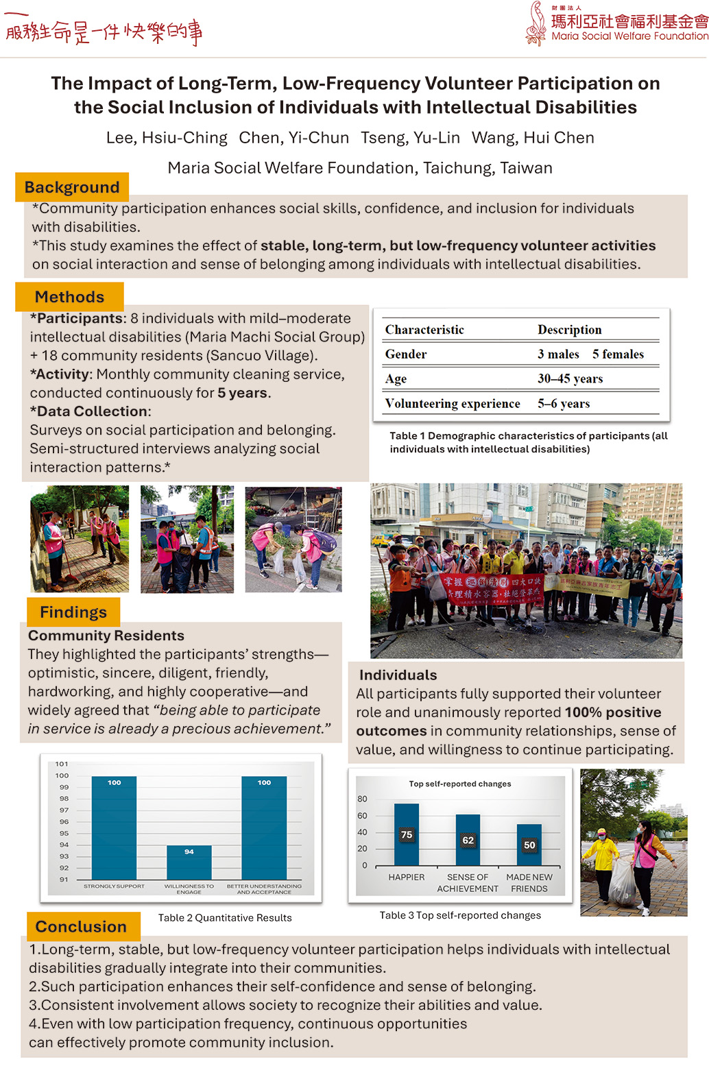 本研究以五年的在地行動作為基礎,再次印證:「長期、穩定、即便低頻」的志工參與,能持續促進智能障礙者的社會互動、自信心與歸屬感,同時也讓社區逐步看見多元群體的能力與價值,進而提升理解與尊重