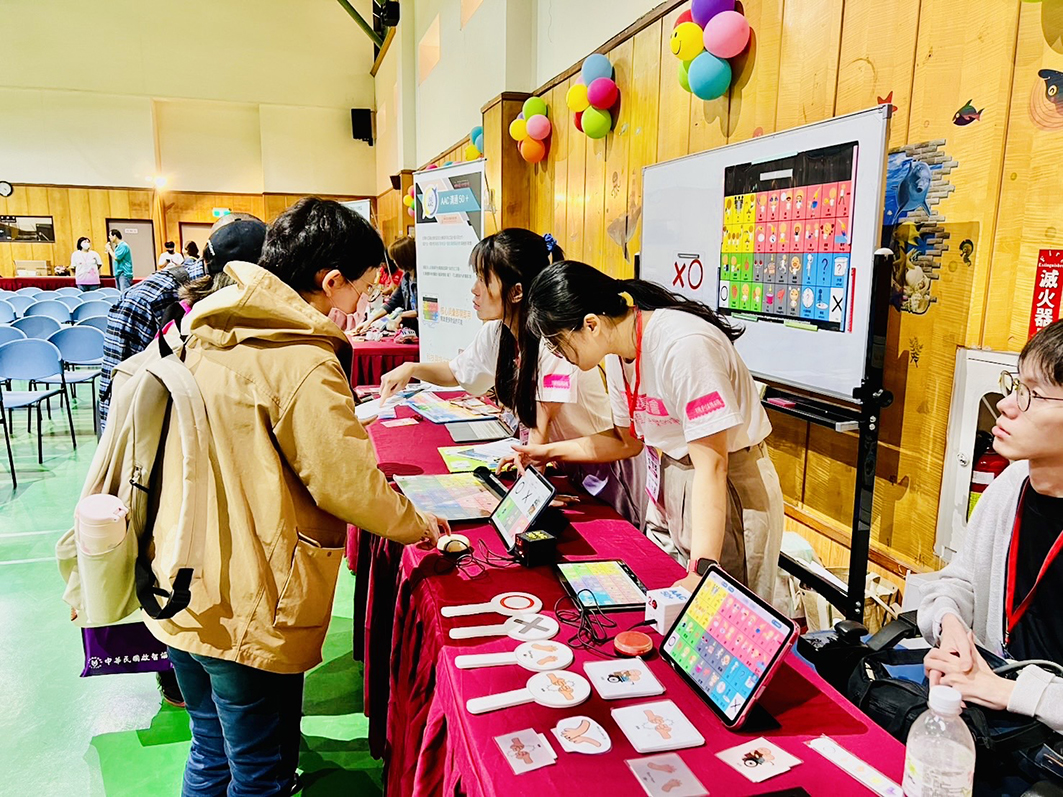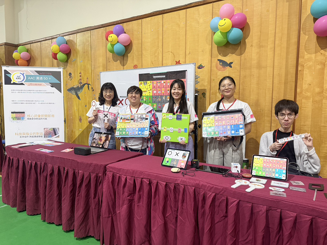 於3 月27 日在彰化舉行的「115 年育智獎頒獎典禮」中,本會以「溝通不設限:AAC 溝通50+,科技與指尖的對話」為主題設立展示攤位。現場由專業工程師郭育瑋、語言治療師張芠馨、張仕旻及教保員黃靖婷組成專業團隊,與來自全國的心智障礙服務的人員及長官交流。