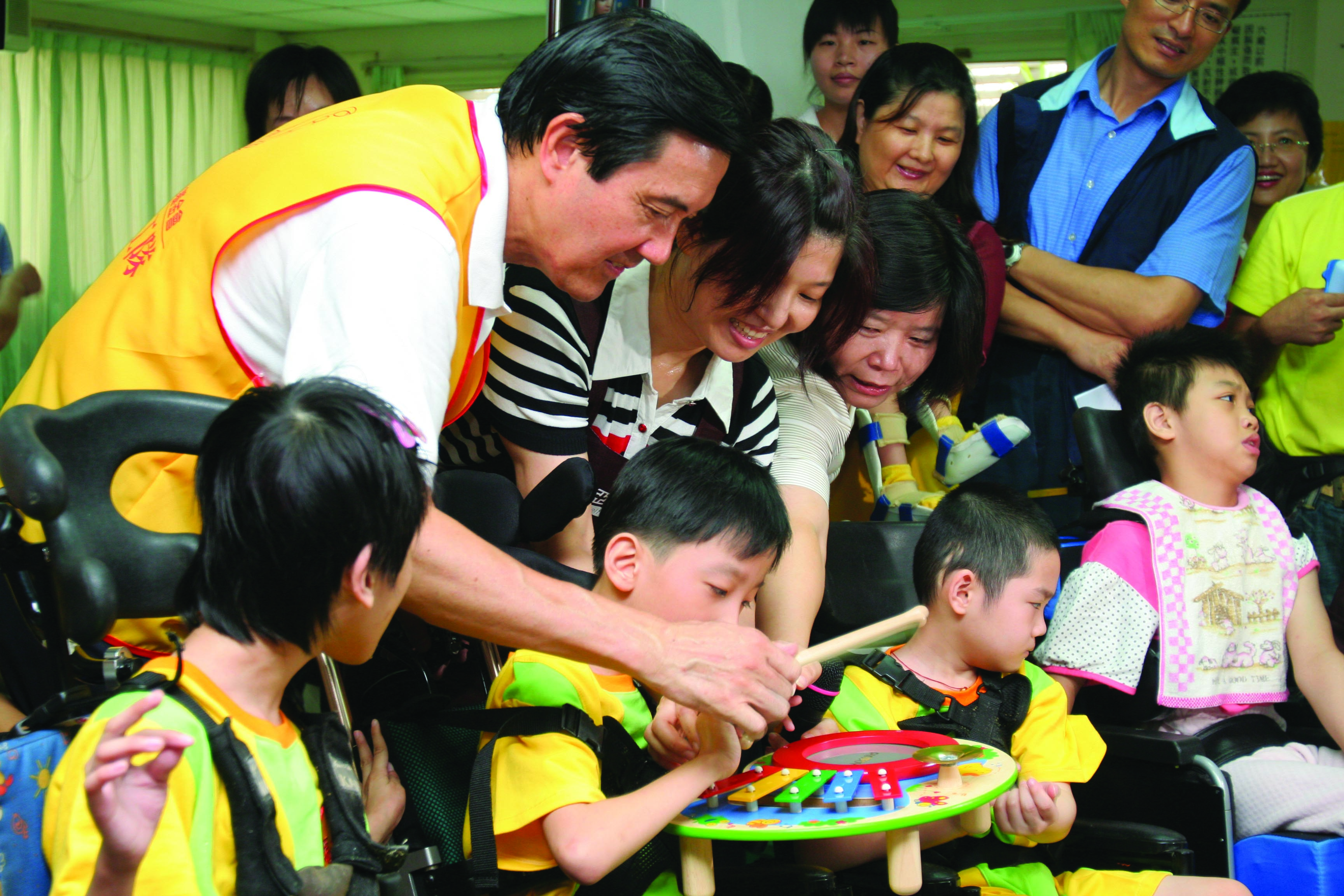 馬英九叔叔今天來到瑪利亞啟智學園擔任實習志工,協助園生進行物理治療,首先幫孩子穿上足托板(其作用幫助穩定關節角度,抑制不正常肌肉張力)後,再與治療師一起從輪椅將孩子抱到傾斜床(其作用是讓身體承受重力訓練站立能力及增加骨質密度),雙腳再綁上腳部副木(其作用固定膝關節打直),綁帶固定後,馬叔叔啟動開關讓園生開始站立訓練,這時用心作完每個動作的馬叔叔已經滿頭大汗了! 馬叔叔擔任實習志工,實地關懷重度腦性麻痺兒童的早期療育,今天除致贈兒童玩具外,更率先捐出7萬元號召籌募擴建啟智學園經費,在陪同的黃義交委員、陳玉梅議員、洪嘉鴻議員、邱淑緹局長、林昭燦先生、薛香川先生、王韻菁小姐、台中市家長協會、博愛基金會共同響應下,短短幾分鐘就募集了20多萬元捐款,讓我們欣喜不已。 馬英九在離去前表示,社會上有身心障礙的兒童很多,除了政府要予以協助外,社會各界也要有同理心,一起努力來幫助這些兒童進行早期療育。 |
