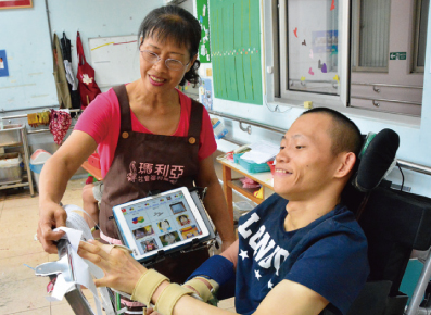 春梅老師說,班上4 位腦性麻痺的服務對象認知普遍雖好,但高張的四肢卻被困在重度肢體障礙的軀殼裡,看著孩子有心無力頹喪的一幕幕,著實令人感到心疼,因此我嘗試與治療師討論,藉助科技輔具開啟服務對象的視野,靈機一動運用善心人士捐贈的i-pad 讓服務對象練習搜尋課程資料、抄寫時事新聞,進而安排口語表達能力較佳的孩子能於課堂上進行簡單的閱讀報告分享,讓學生從參與實踐的過程破除直線思考的慣性。