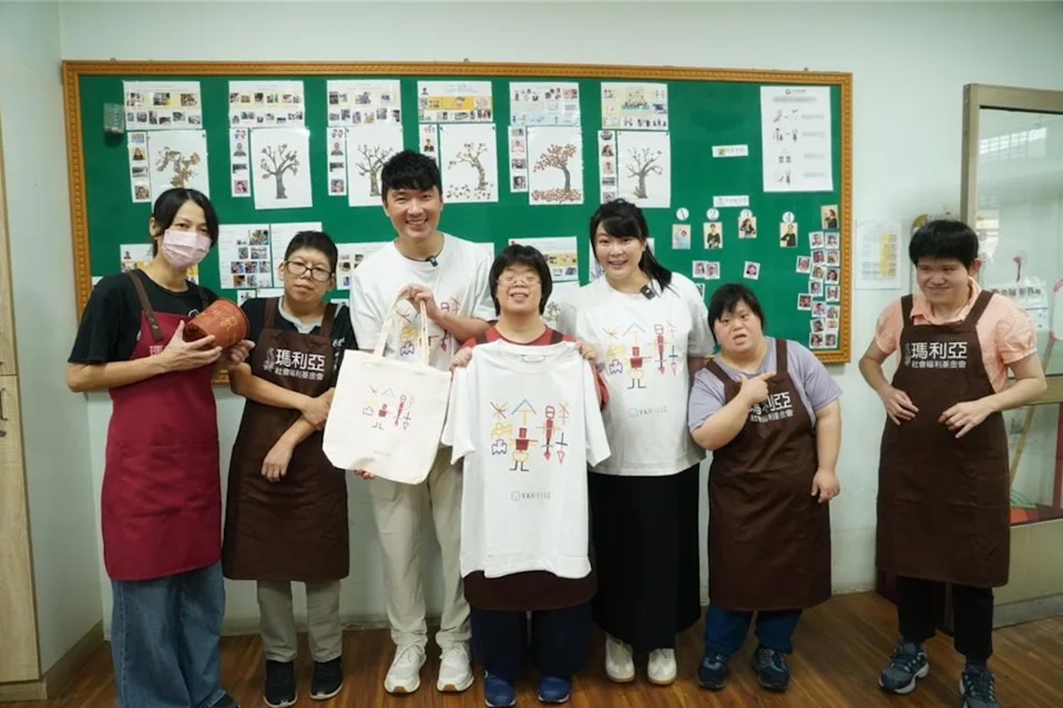 溫倪詩共同創辦人邱子軒、鄭羽珈更被現場溫馨氣氛所染,數度感動落淚。整場活動不僅展現了社會各界對心智障礙者晚年安置議題的關注,也讓愛與善意在螢幕前後持續傳遞。 患有唐氏症與中度智能障礙的寶寬,3歲到愛心家園接受早療開始,便與瑪利亞結下緣份。樂天、貼心、笑口常開的她,幾乎看不出來今年33歲了,寶寬興趣廣泛,喜歡跳舞、唱歌、手工藝、繪畫,尤其是受到瑪利亞推行PCP(以個人為中心的計畫)的支持,平常就愛隨手塗鴉,天馬行空創作的寶寬,在教保員的引導下,將原本彩繪在小花盆上的鮮艷畫作,化為溫倪詩公益T-shirt與提袋的主視覺。寶寬在親眼看到自己的畫作「被人穿在身上」,感覺相當開心!