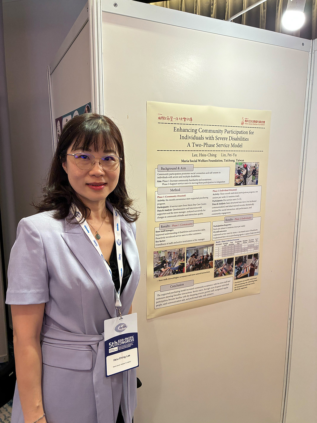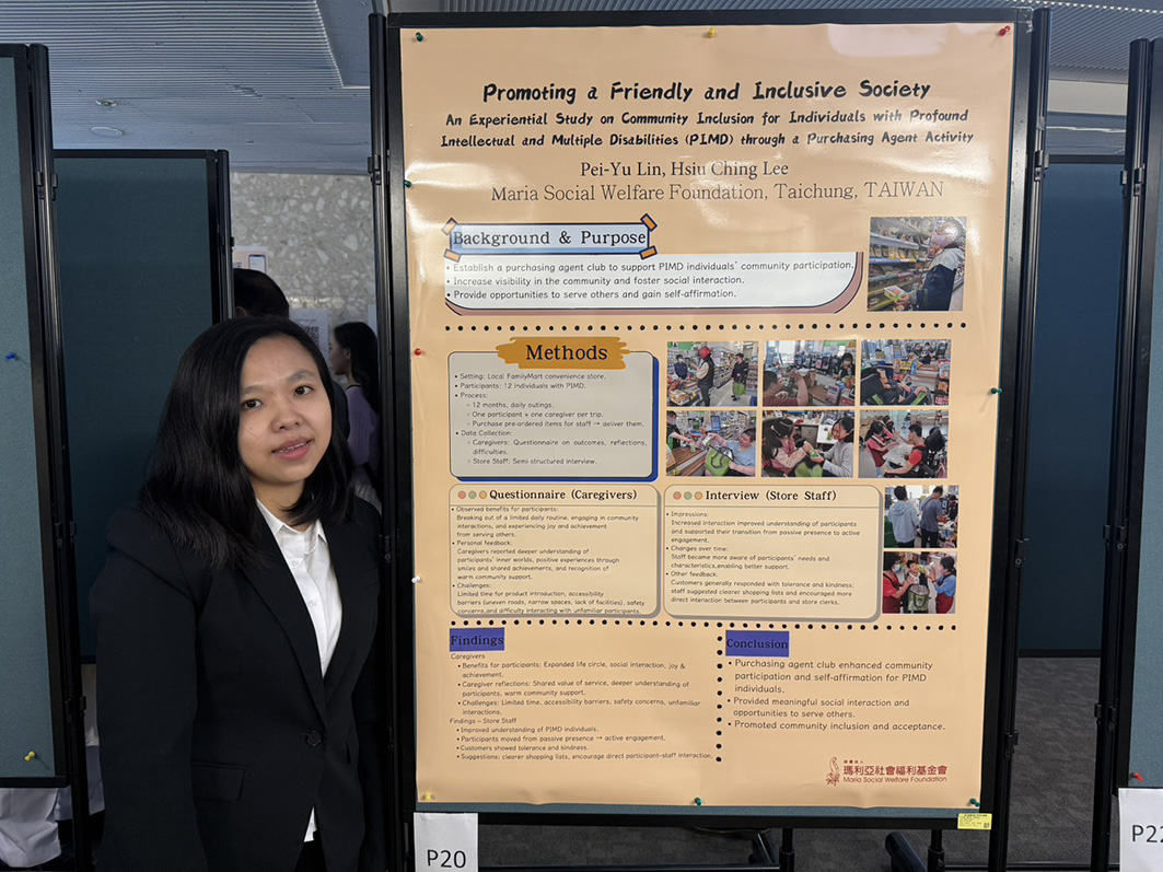 10月15日至17日,李琇菁主任於新加坡舉行的 IASSIDD亞太區國際學術研討會(The Asia-Pacific Regional Congress of the International Association for the Scientific Study of Intellectual and Developmental Disabilities)發表研究〈促進極重度智能及多重障礙者社區參與:一個有意義投入的服務模式〉。研究聚焦於服務對象的成長與變化,透過小組外出與便利商店代購任務,觀察到參與者逐漸能主動與店員互動、使用溝通輔具表達需求,並從任務完成中獲得自信與歸屬感。