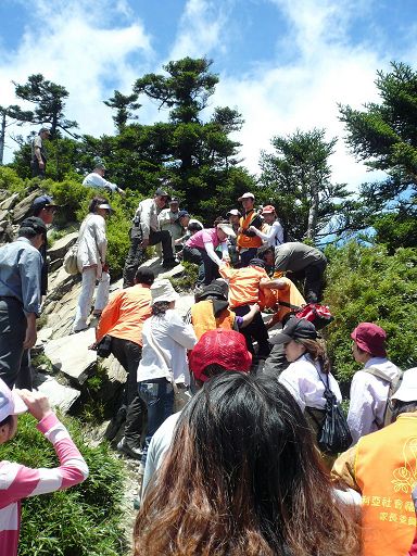 全體師生及就難協會出發前在霧峰家園門口大合照 / 大家互相合作、努力不懈,誓言登頂 霧峰教養家園 吳東展 有多久沒眺望群山萬嶺;有多久沒聽見大自然的呼吸聲;又有多久沒置身於雲海間,閉上雙眼讓時光倒轉… 7月19日我們擁有始無前例、精彩美好的旅行,這都要感謝台中縣救難協會協助瑪利亞霧峰家園所舉辦的「征服百岳、開闊視野」合歡山之旅,讓我們有不同的體驗,在攻頂剎那間,我的心底湧出一股暖流,那種喜悅是言語、筆墨難以形容的! 為了這次活動可以圓滿順利,園長、主任、各組組長、老師們及救難協會全體總動員,在出發前做好完善的規劃與準備,包括:動線的設計、醫療的支援、人力的分配與協助、物力的供應等,並有專業醫療團隊的支援讓我們可以無後顧之憂的帶領學生進行這難得的體驗,甚至還貼心地考慮到天候不佳時的替代方案,畢竟這次合歡山之旅,在特殊教育領域,可說是一項創舉!所有的一切都是希望參與者可以留下深刻美好的記憶。 從霧峰家園到合歡山約三個小時的車程,滿心期待的我們到達目的地時,看見一座座高山被浮雲環繞著,涼風徐徐地吹在臉上,心裡有一種放鬆的感覺,似乎把所有煩惱都拋開於山谷下…。但在準備攻頂時,才發現這是一條艱辛的旅程,學生們第一次體驗,也是老師們第一次的經驗,所有狀況都得臨時反應,例如:崎嶇不平的山路走起來非常吃力、高山空氣稀薄造成呼吸困難、擔心學生們當時的身體狀況是否能夠適應…等等,幸好有救難協會大力的協助,再加上主任、老師們堅持不放棄,一路的鼓勵、支持,在經歷千辛萬苦、寒風刺骨、重重危險後,我們終於突破重圍,順利攻頂! 登高才能望遠,站在三千多公尺的合歡山主峰,眺望浮雲,俯瞰地平線,眼前的美景是合作與分享後的收穫,是屬於大家共有的!此時心裡無限地感動,眼角不自覺濕潤…原來,不只我,不只老師們,連學生都可以一起『征服百岳、開闊視野』。 回憶像泉水般綿綿不斷,彷彿拼湊出片片深刻的記憶拼圖,在每一個參與旅程者心中流竄。雖然這次合歡山之旅的過程中,讓老師們又驚又喜,驚嚇程度百分百,可是最後大家一致認為對學生而言,這是一趟無可取代、成功且美好的旅程,為他們開拓了豐富的生活經驗與視野;再一次感謝台中縣救難協會帶給我們這樣的機會。